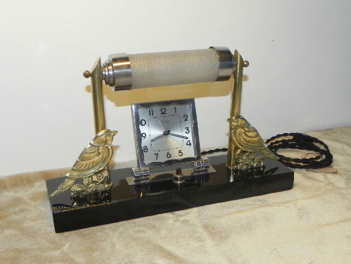 Lampe horloge Art-Déco aux oiseaux. Bois laqué, laiton brut, laiton chromé et verre granité. L'électricité est entièrement restaurée mais la pendulette ne fonctionne pas correctement.