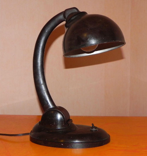 Grande lampe de bureau en bakélite et tôle. Circa 1940 - Marque REAR. Origine Lettonie ou Russie. Haut. 49 cm, Ø 30 cm, poids 3,5 kg.